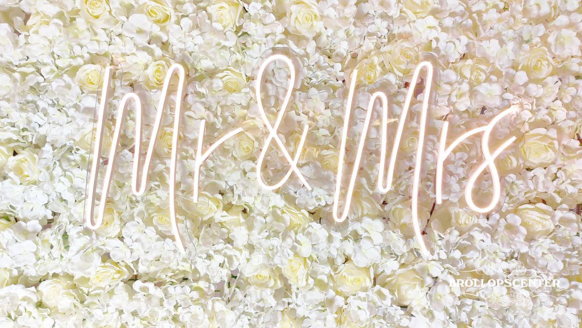 Hyr neonskyltar Mr & Mrs att använda på blomsterväggen, fotoväggen eller honnörsordet.